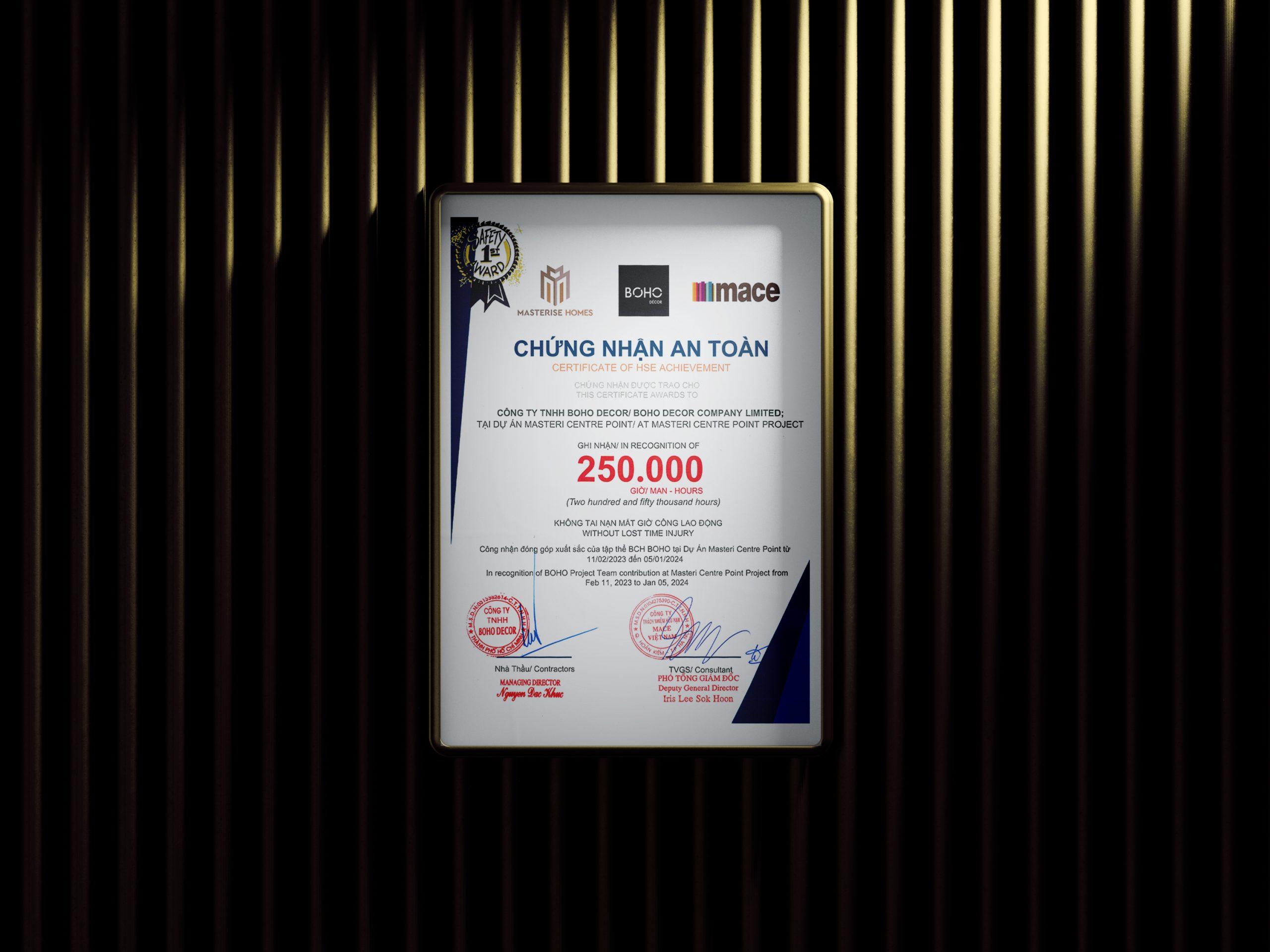 BOHO NHẬN GIẤY CHỨNG NHẬN AN TOÀN LAO ĐỘNG TẠI DỰ ÁN MASTERI CENTRE POINT
