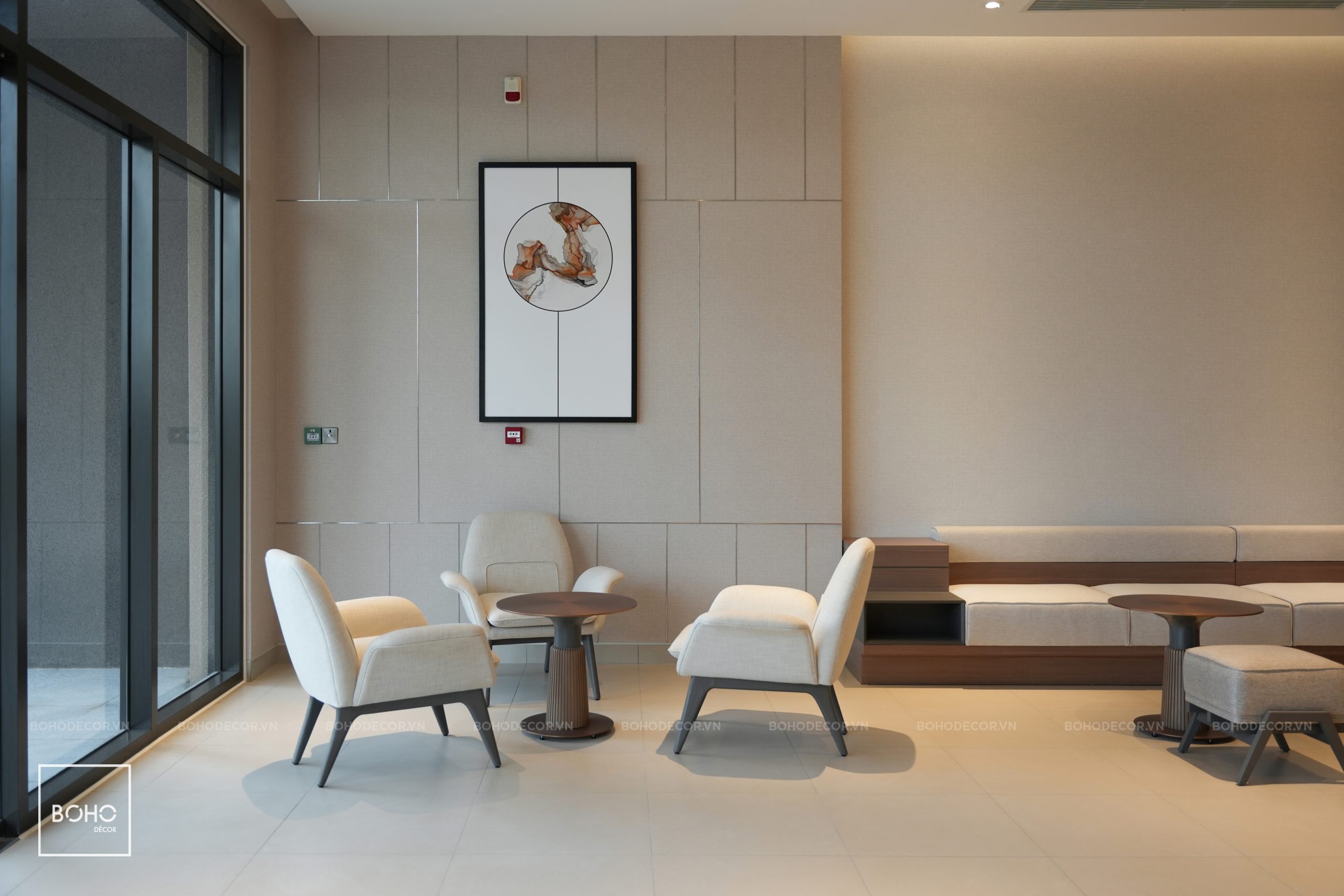 As the contractor for the interior construction and installation of the main lobby and all ground-floor amenities across the 4 towers AK7, AK8, AK9, and AK NEO in Block F, BOHO Décor focuses on both technical excellence and aesthetics. This area serves as the first welcoming space for residents and visitors, so every detail has been meticulously crafted. From selecting materials in neutral tones such as white, gray, and light brown to integrating natural elements like wood and stone, each choice has been carefully considered to create a light and harmonious atmosphere in every space.